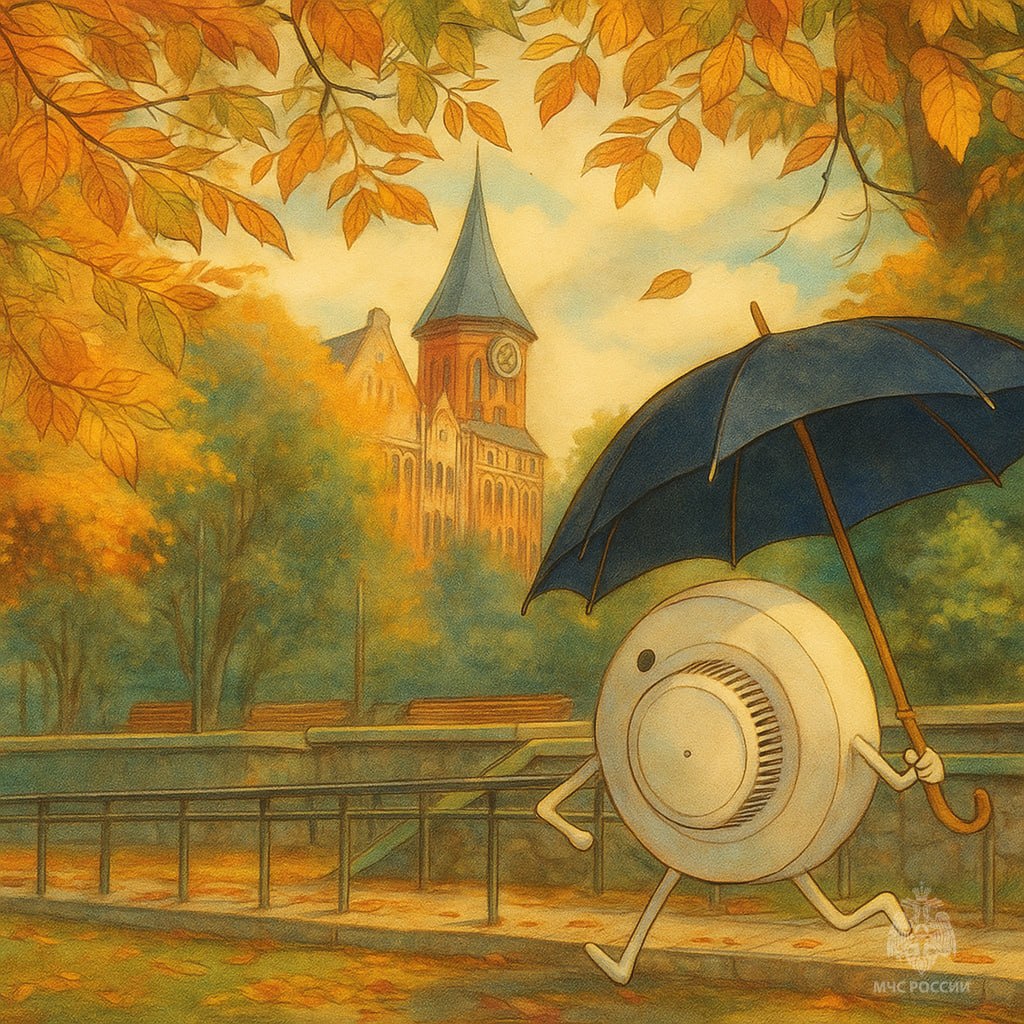 Видишь этого одинокого путника? Это пожарный извещатель. Он гуляет по осеннему острову Иммануила Канта, размышляя о том, как важно вовремя позаботиться о себе и своих близких.