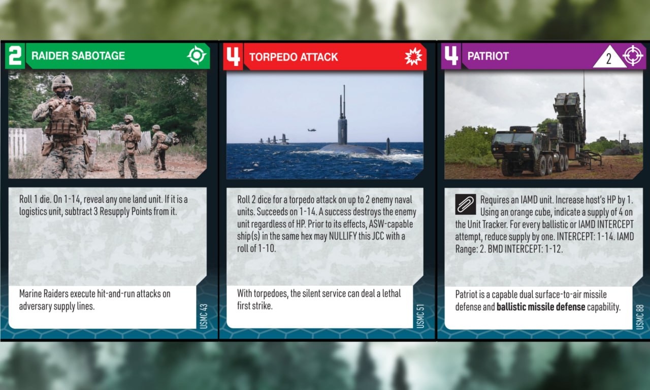 На американской стороне выступают Корпус морской пехоты и Военно-морские силы США, а также некоторые армейские подразделения. Они противостоят российской морской пехоте, воздушно-десантным войскам и кораблям Балтийского флота. Подразделения, обозначенные на карте картонными фигурками, различаются по огневой мощи, дальности и скорости действия. На 277-и картах «Объединённых возможностей» представлены различные тактики, от ударов стратегических бомбардировщиков до рейдов спецназа, психологических операций и кибервойны. В игре отображено даже такие понятия как «Индикатор влияния» и «Общественное мнение».