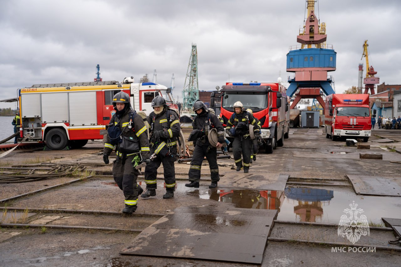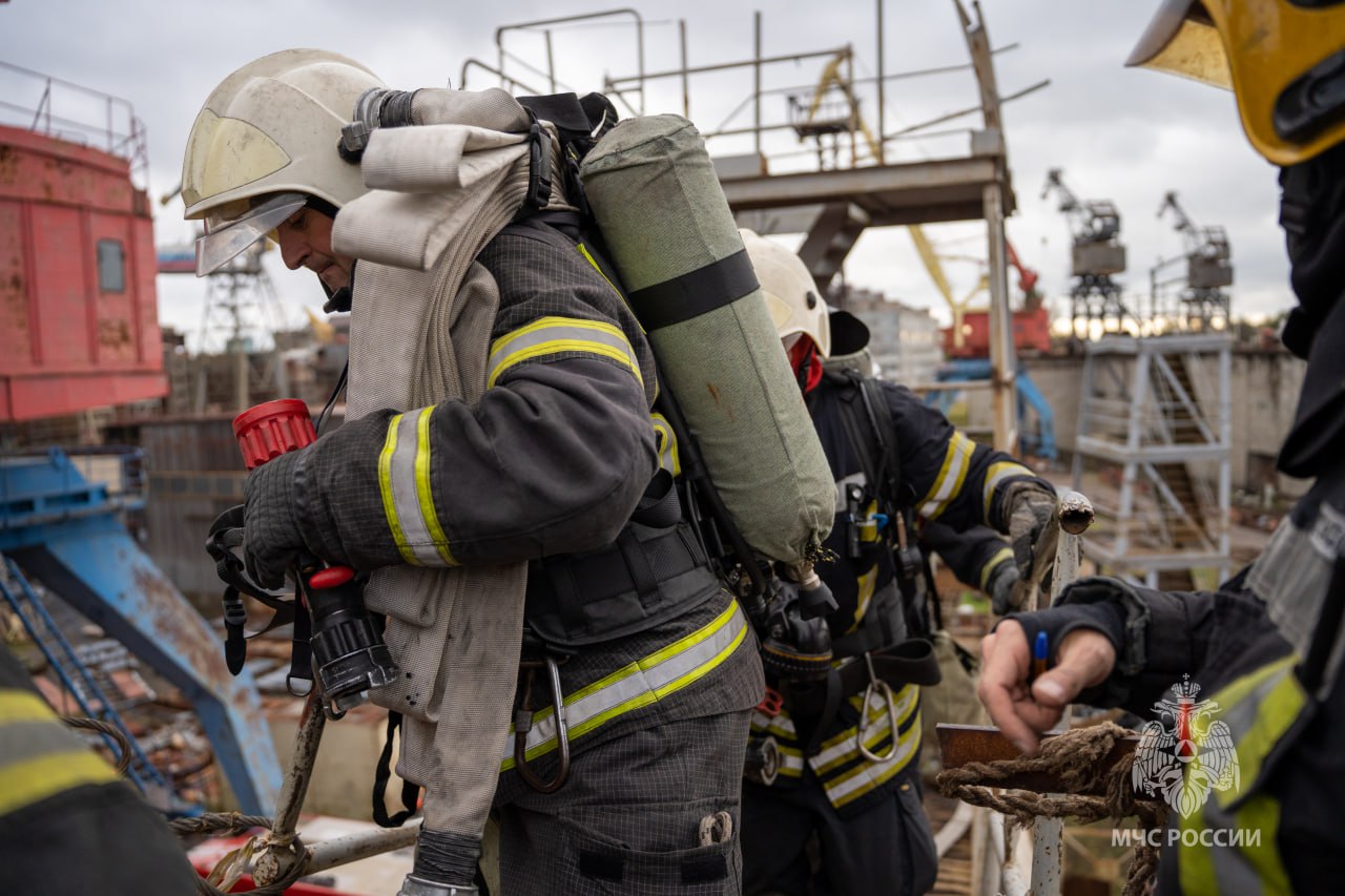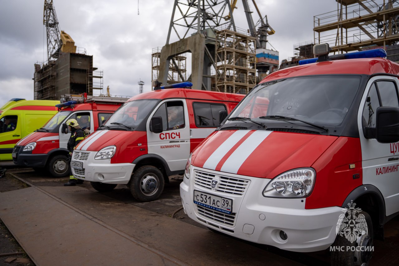 В Калининграде на территории Прибалтийского судостроительного завода «Янтарь» прошли тренировочные пожарно-тактические учения