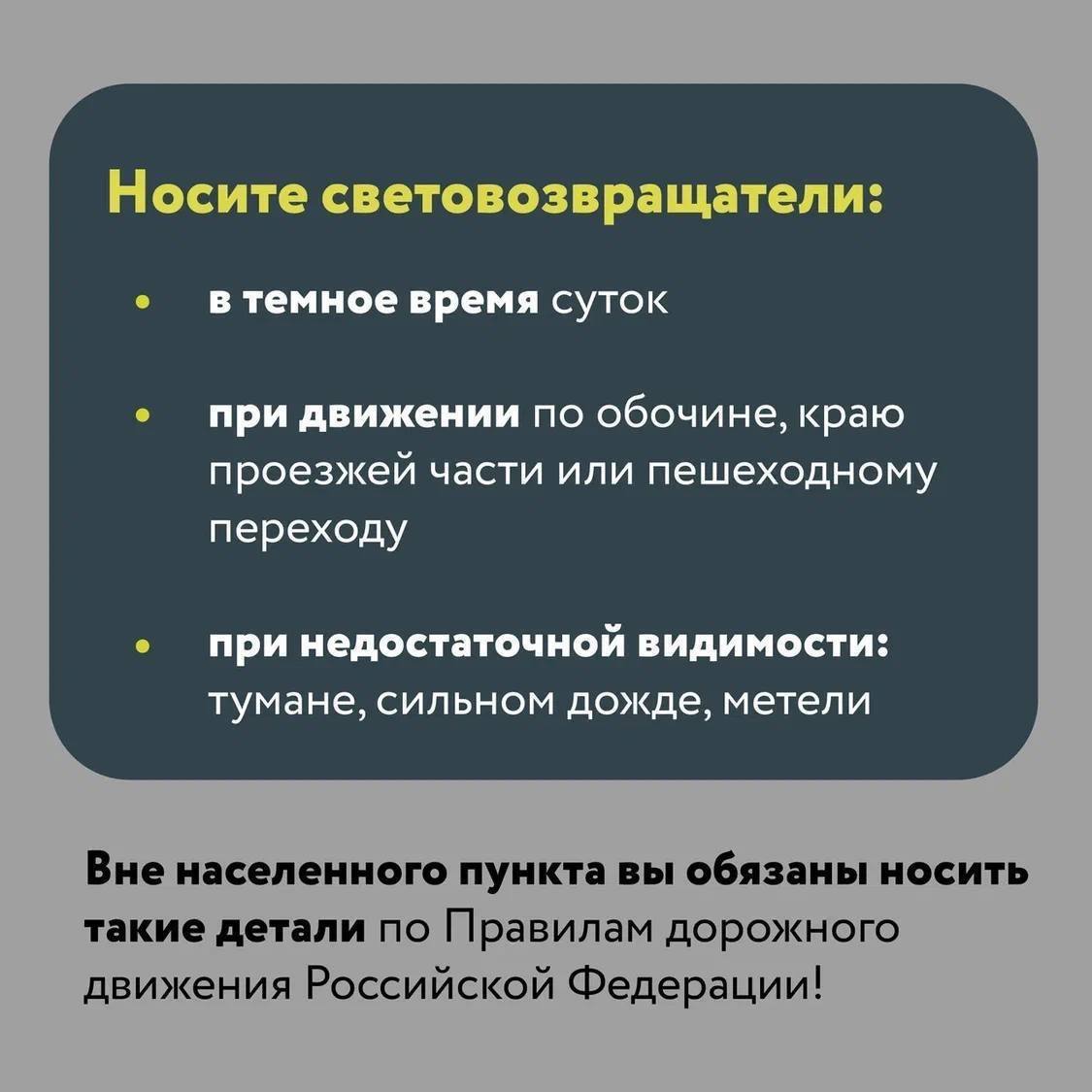 Согласно ПДД РФ, при переходе дороги и движении по обочинам или краю проезжей части в темное время суток или в условиях недостаточной видимости пешеходам рекомендуется, а вне населенных пунктов пешеходы обязаны иметь при себе предметы со световозвращающими элементами и обеспечивать видимость этих предметов водителями транспортных средств.