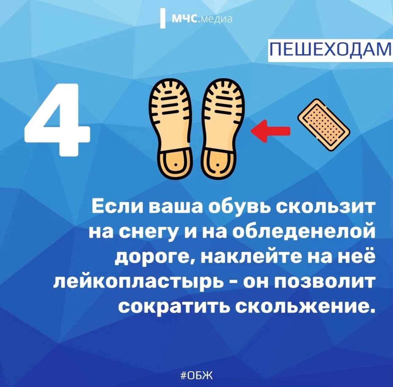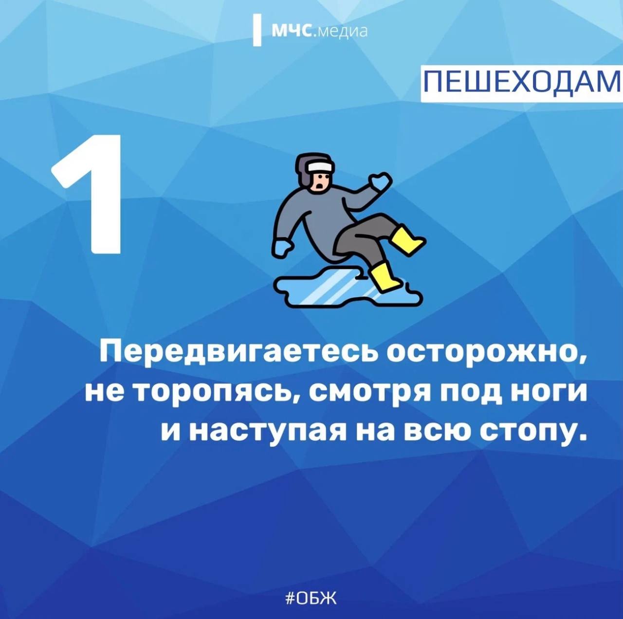 Пешеходам: будьте внимательны при передвижении, избегайте необязательных выходов на улицу. Выбирайте безопасную обувь без скользкой подошвы. Остерегайтесь сосулек и снега, падающего с крыш.