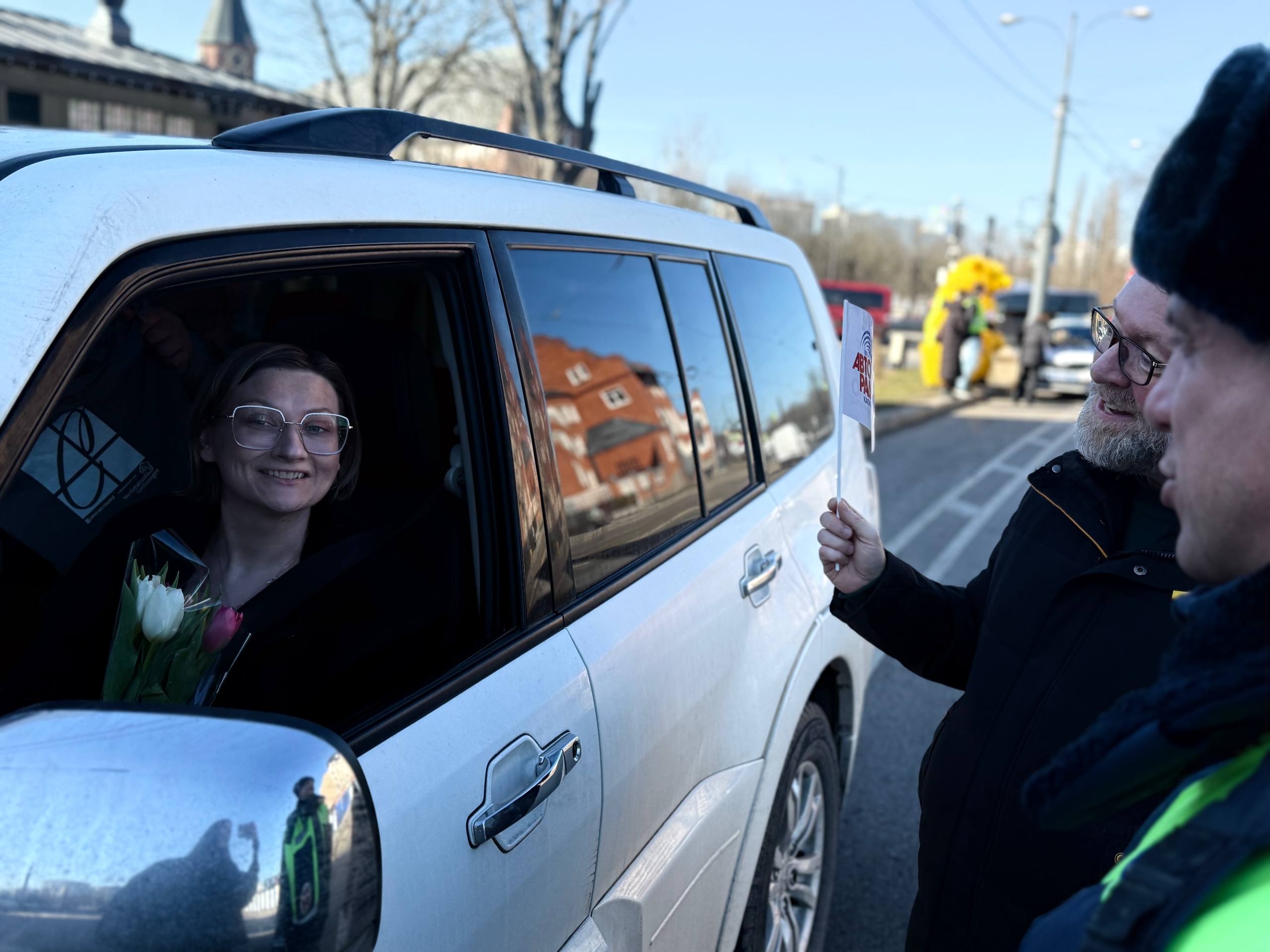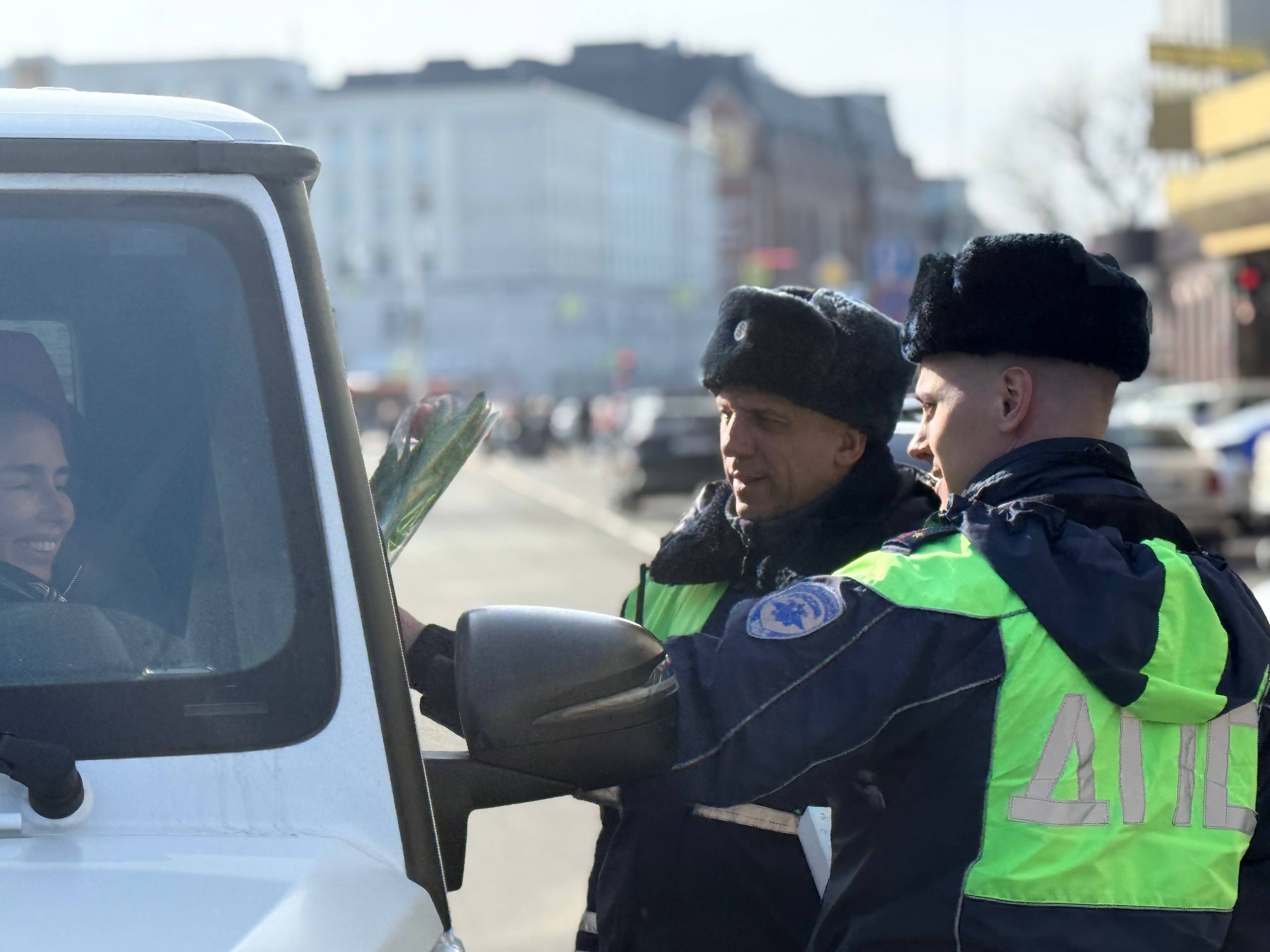 Под предлогом проверки документов сотрудники Госавтоинспекции останавливали автомобили, которыми управляли девушки и вместе с представителями «Авторадио» и «Медиа Траст» желали им безопасных дорог и вручали букеты цветов.