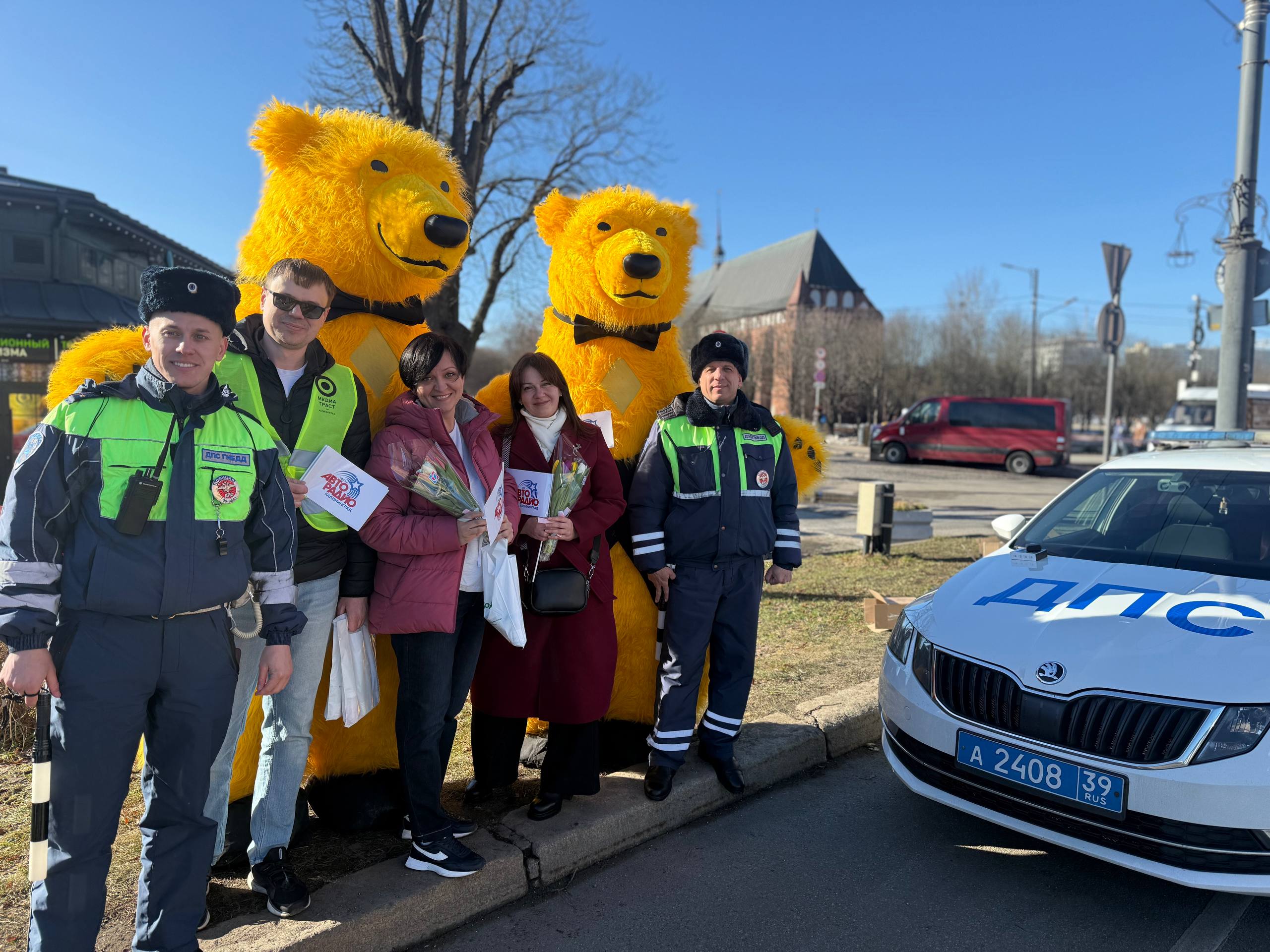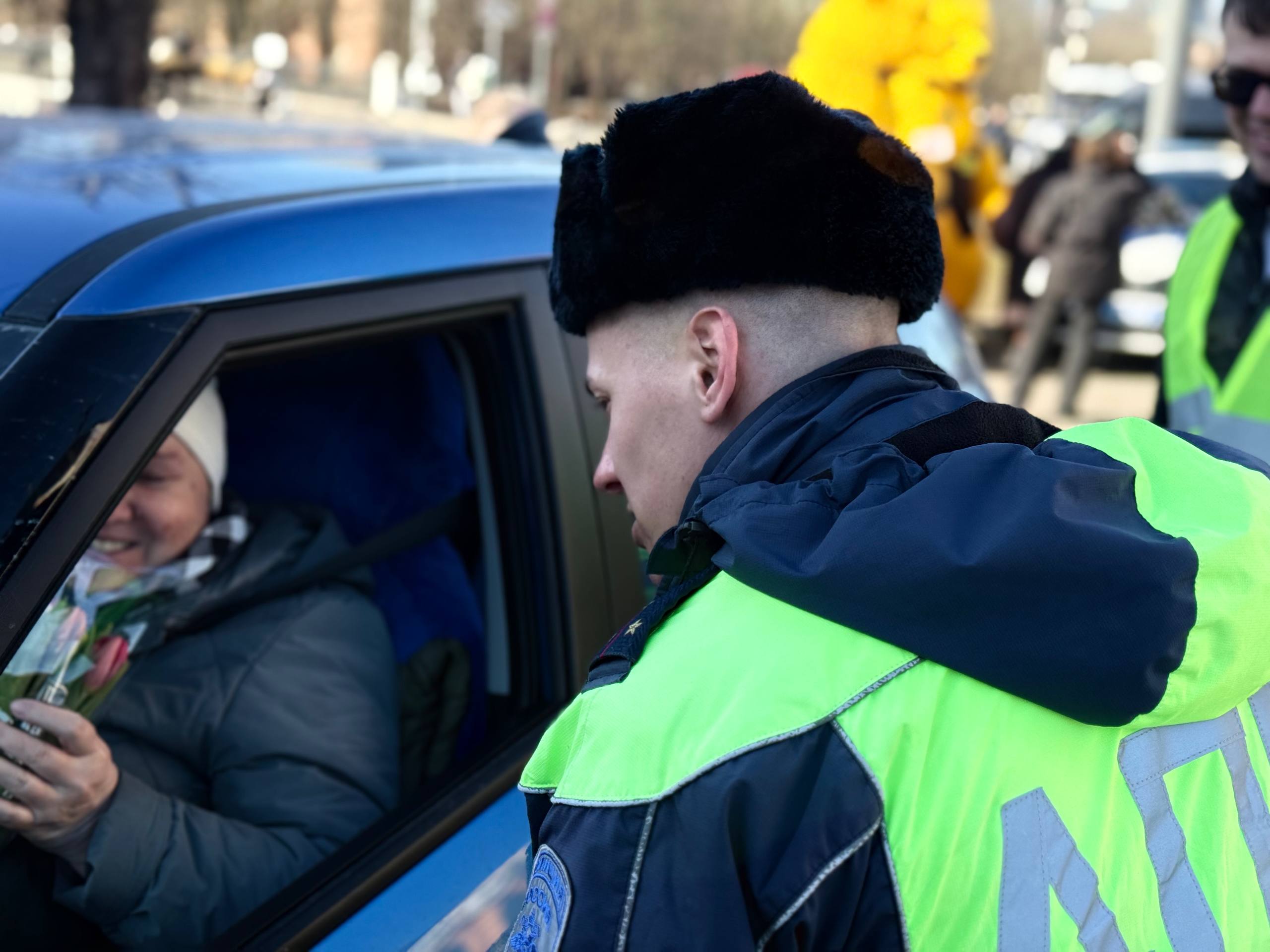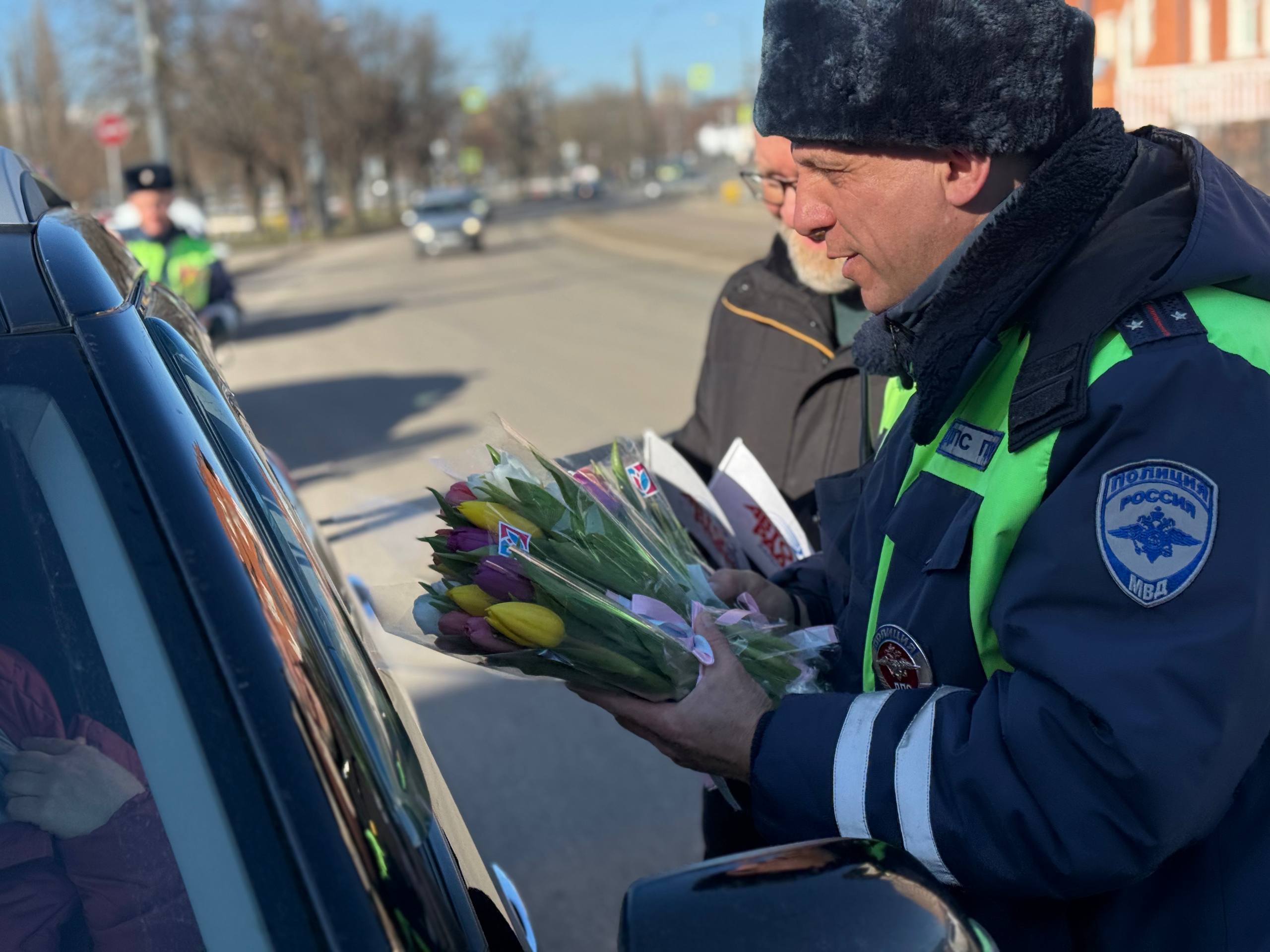 Сотрудники Госавтоинспекции совместно с представителями радиостанции «Авторадио» и «Медиа Траст» поздравили представительниц прекрасного пола с праздником весны