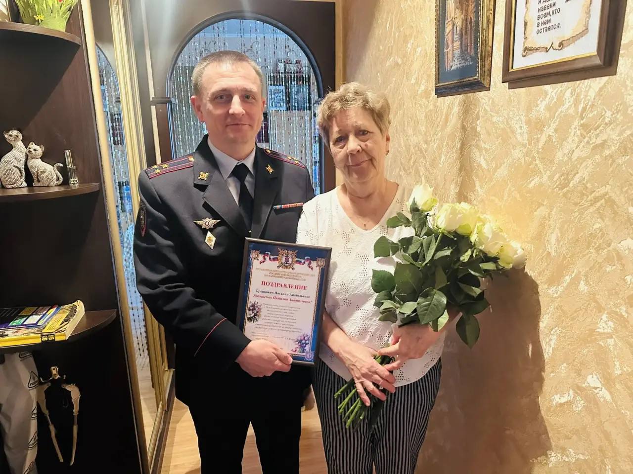 Дмитрий Анатольевич передал Наталье Николаевне поздравление от имени врио начальника УМВД Сергея Рейсона, вручил букет цветов и памятный подарок. Полицейские пожелали маме сослуживца крепкого здоровья, благополучия и отличного настроения.