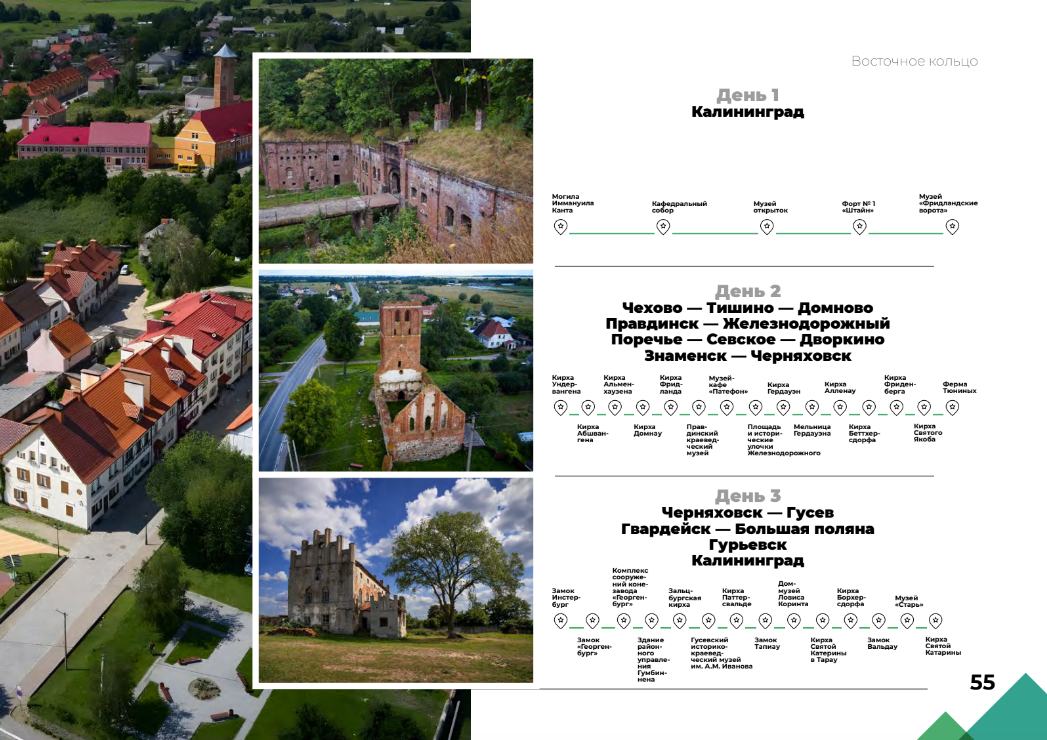 Рекомендуют проехать на автомобиле до могилы Канта на острове Канта, посетить Кафедральный собор, оттуда отправиться в Музей открыток, далее в форт №1 «Штайн» и потом в музей «Фридландские ворота».