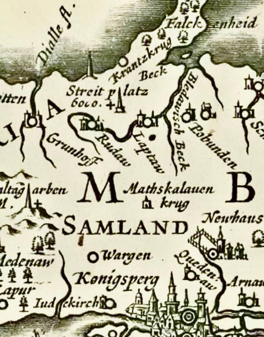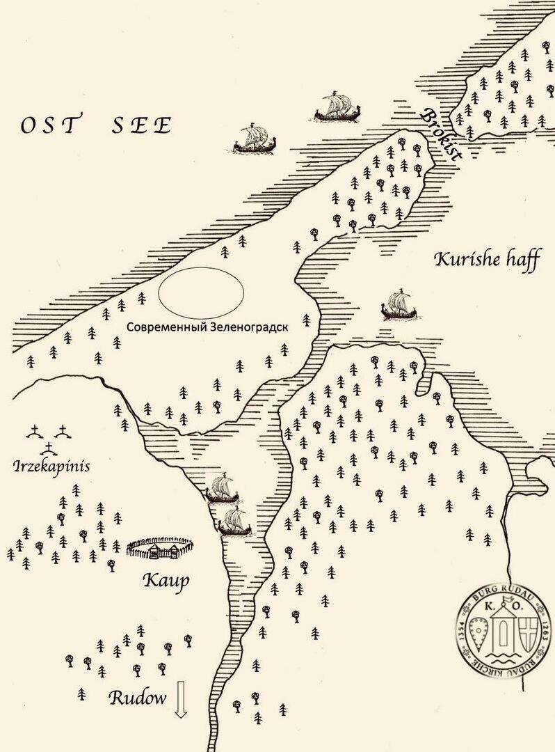 На самой старой и детализированной карте Пруссии Гаспара Хеннеберга 1649 года указана река Кинтау или Кинтаубах, которая проходит от Рудау до Куршского залива. Сейчас она называется Зеленоградка и пролегает между Озерово и Муромским. Далее путь к заливу перекрывает болото.