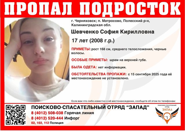 В Калининградской области ищут 17-летнюю Софию Шевченко, которая пропала месяц назад. Об этом сообщает ПСО «Запад».