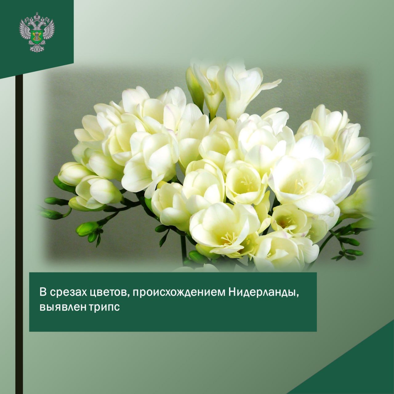 В срезанных цветах (фрезия) в количестве 50 штук, происхождением из Нидерландов, выявлен карантинный объект – западный цветочный трипс. Наличие объекта подтверждено заключением Калининградской испытательной лаборатории ФГБУ «ВНИИЗЖ».