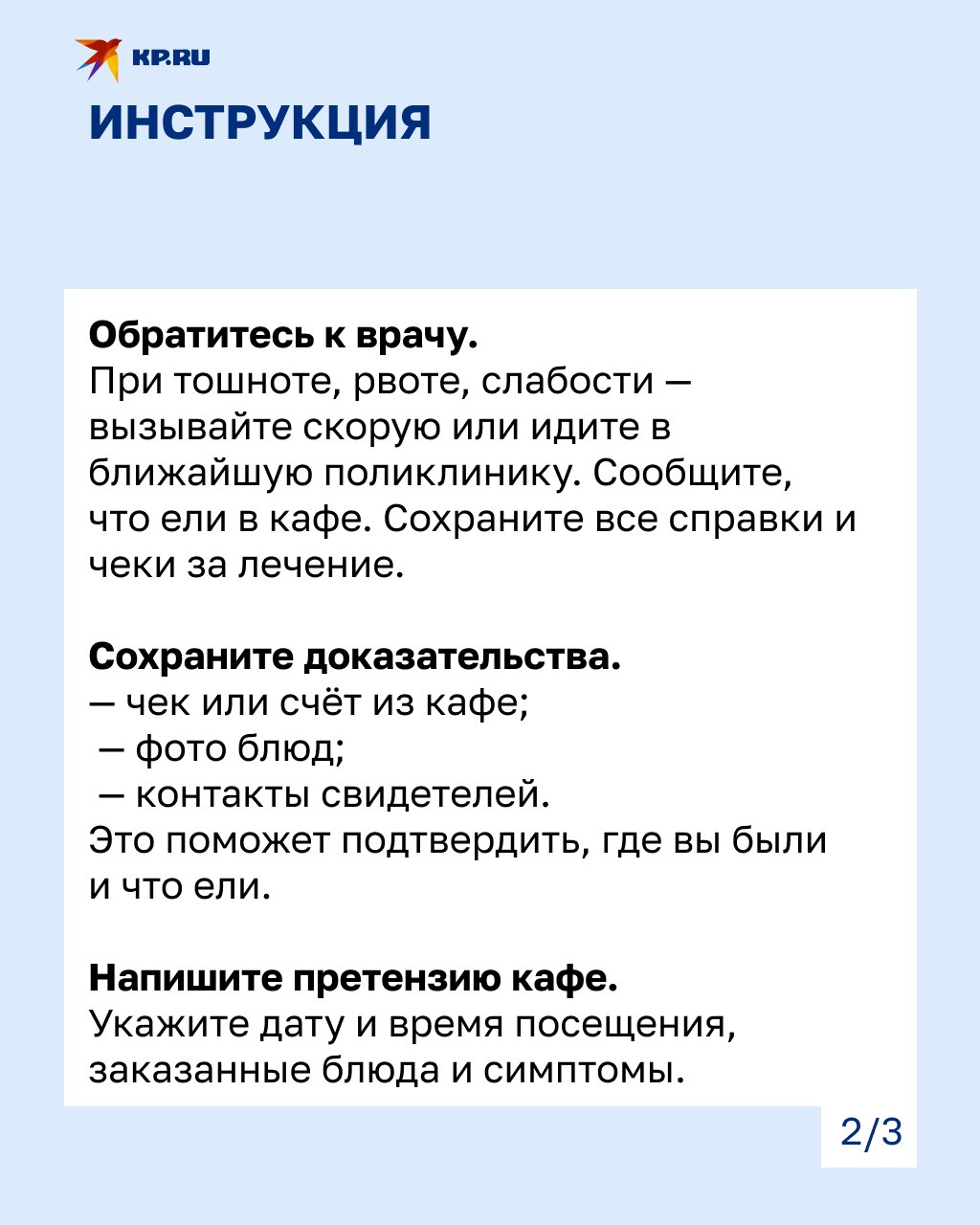 Отравление в кафе или ресторане – неприятная ситуация, но важно знать, как действовать, чтобы минимизировать последствия и защитить свои права. Алгоритм действий — в карточках