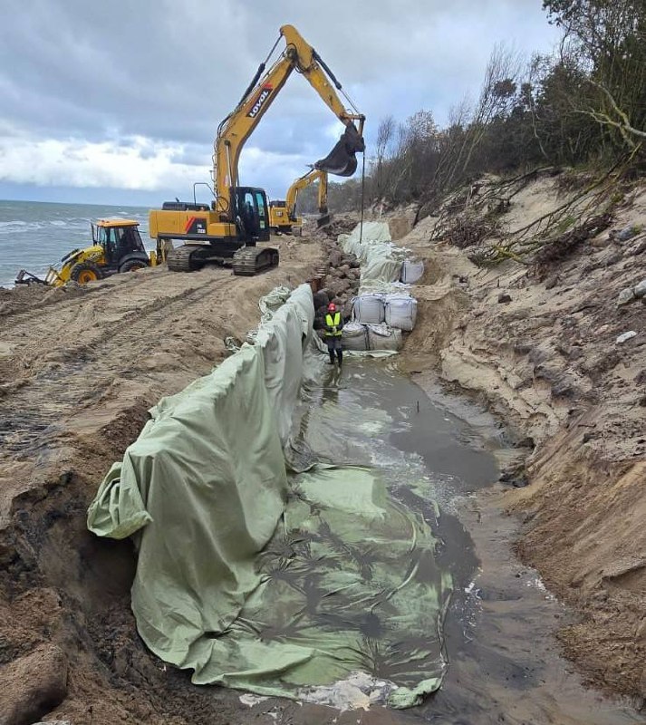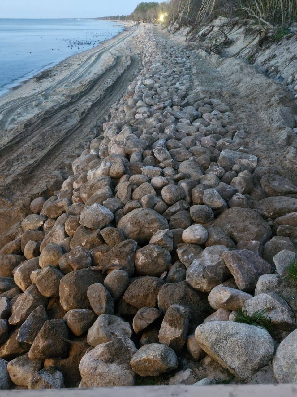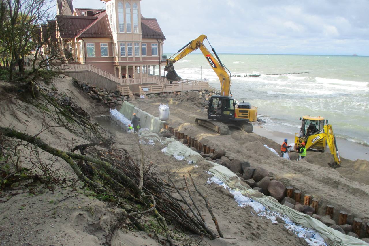 К укреплению восточной части побережья в Зеленоградске приступили в апреле. Для этого используют конструктив из деревянных свай, непроницаемого ядра из биг-бэгов и внешней наклонной наброски из защитного крупногабаритного камня. Также работы предусматривают намыв пляжа на протяжении шести километров.
