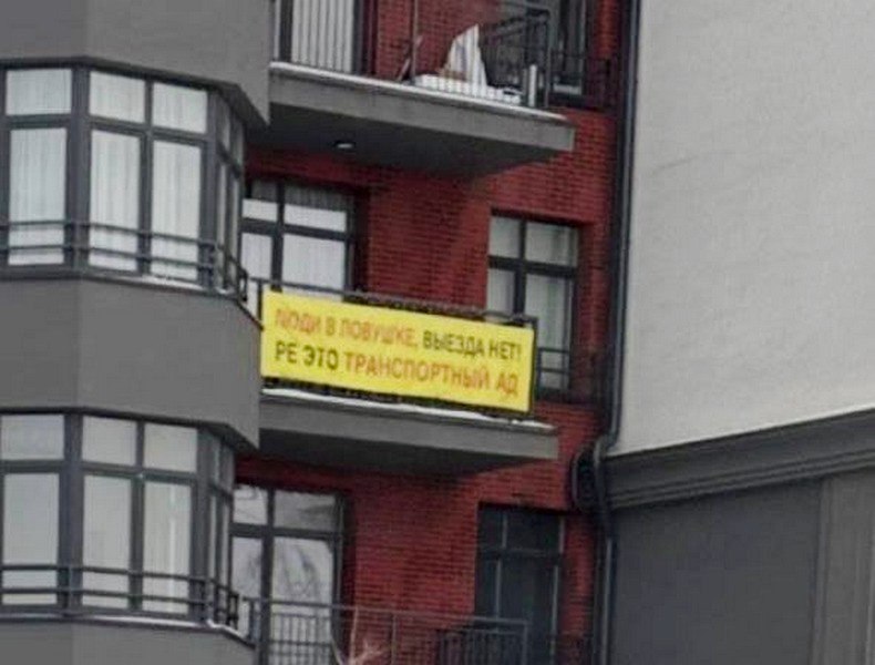Чёрным по ярко жёлтому (видимо, чтобы было заметно издалека) написано: «Поликлиника есть, парковки нет», «Люди в ловушке, выезда нет. РЕ это транспортный ад».