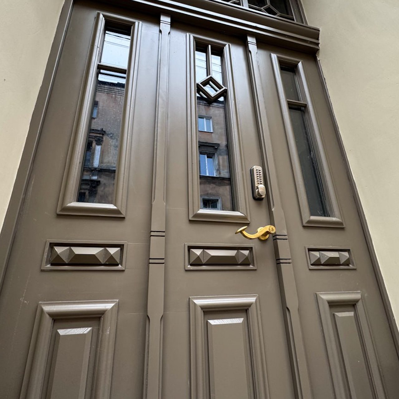 С учётом облика дома установили и новые двери с алмазными рустами.