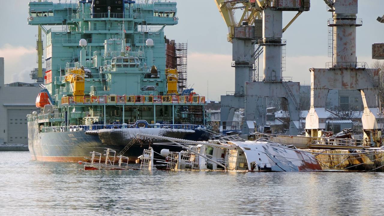 Пошел уже пятый месяц, как новейший морской буксир для ВМФ РФ проекта 23470 «Капитан Ушаков» затонувший ещё в начале августа (с технической готовностью 97 %) продолжает «отдыхать» в затопленном состоянии у причала Балтийского завода в Санкт-Петербурге.