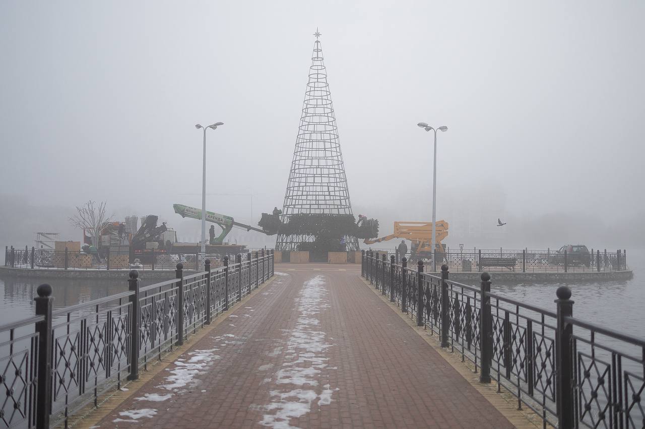 Фото дня: установка ёлки на Верхнем озере в туманном Калининграде