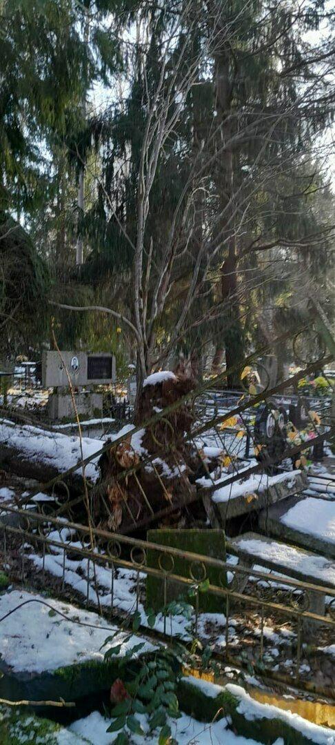 На кладбище в калининградском микрорайоне Космодемьянского рухнула ель, закрыв проход к захоронениям и повредив один из памятников