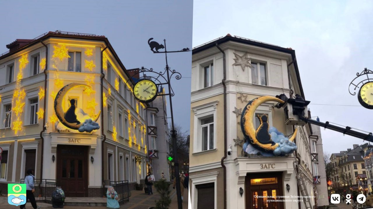 В Зеленоградске украсили главный фасад здания ЗАГСа светящимся барельефом с фигуркой кота, сидящего на месяце.