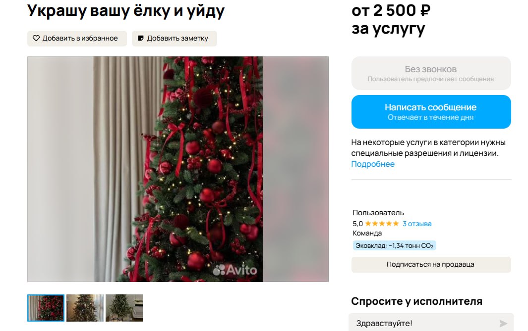 Стоимость услуг начинается от 2000 рублей и может достигать 7000. В неё не входят украшения: их предоставляет заказчик. Однако авторы объявлений предлагают свои услуги в части покупки украшений и даже ёлки.