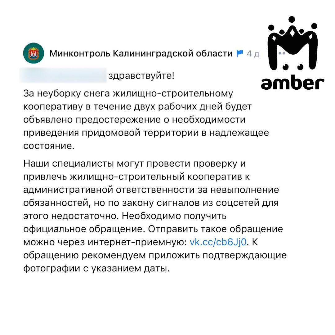 Управляшка в Балтоне забила на уборку снега и предостережение Минконтроля, а Минконтроль забил на контроль, жалуются жители.