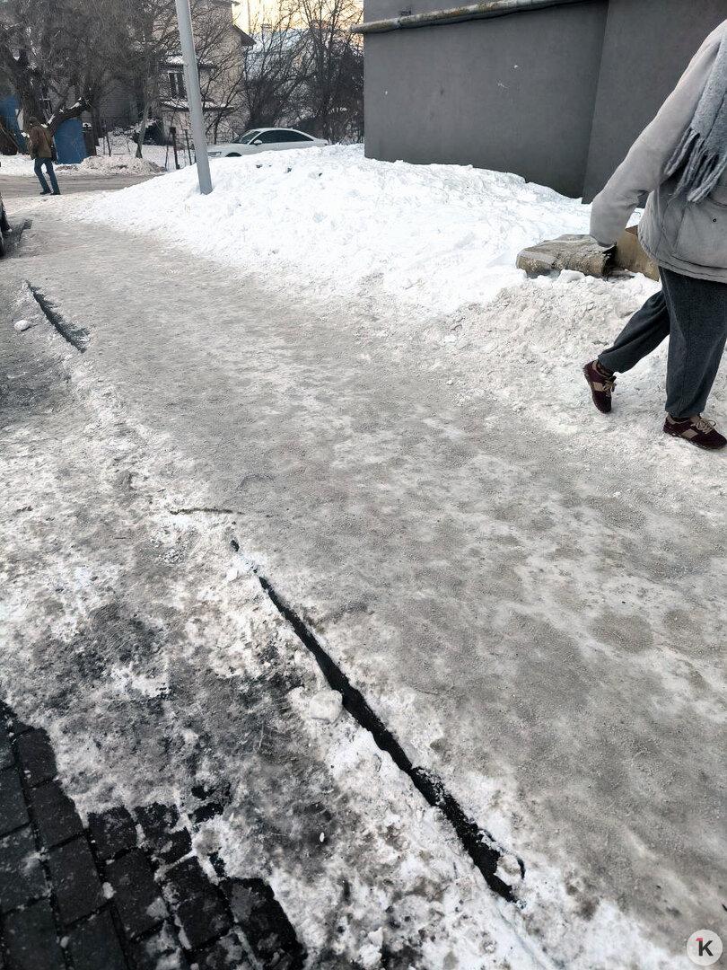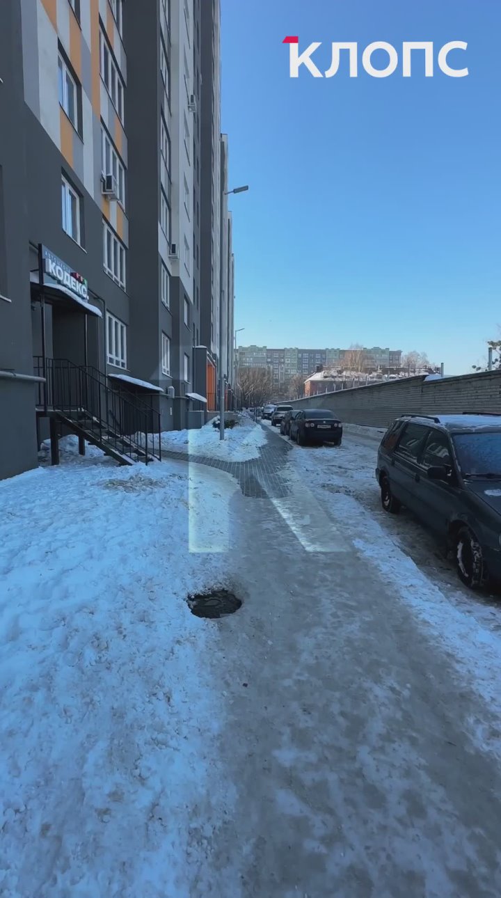 Девушка упала на нечищенной пешеходной дорожке на улице Дадаева. Местные жители утверждают, что скользят там постоянно и уже устали требовать у своей УК уборки.