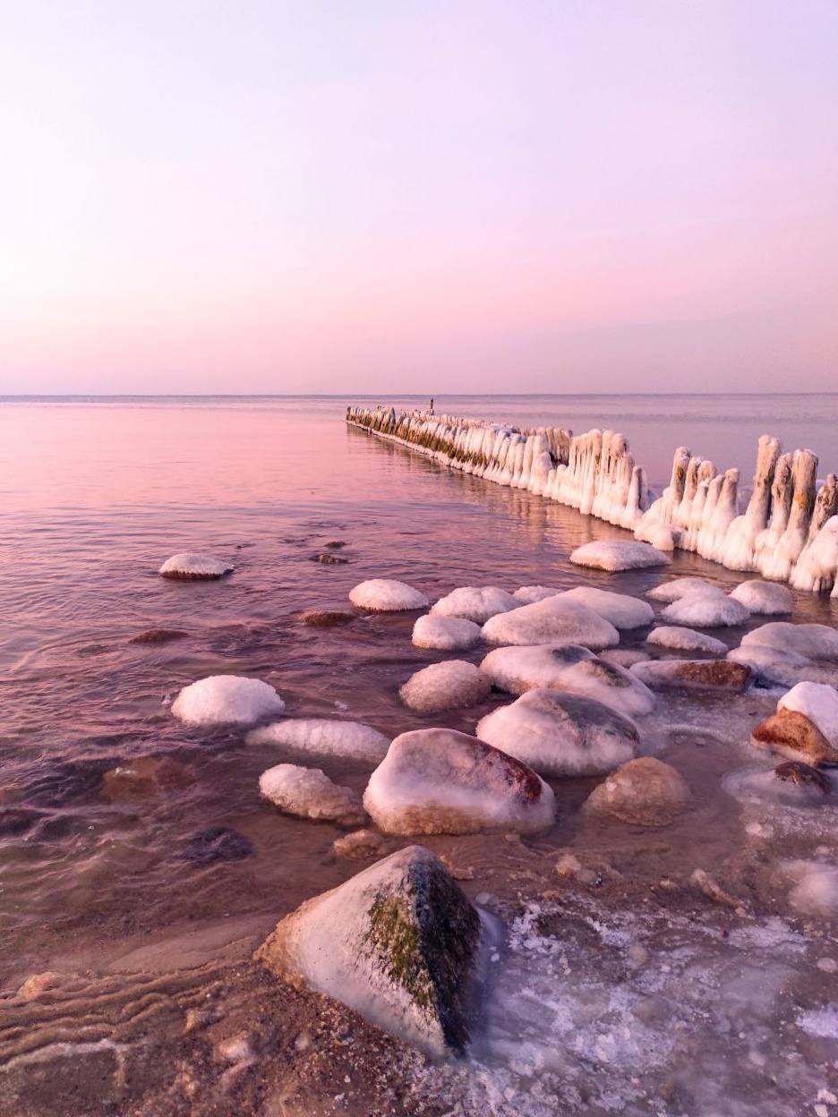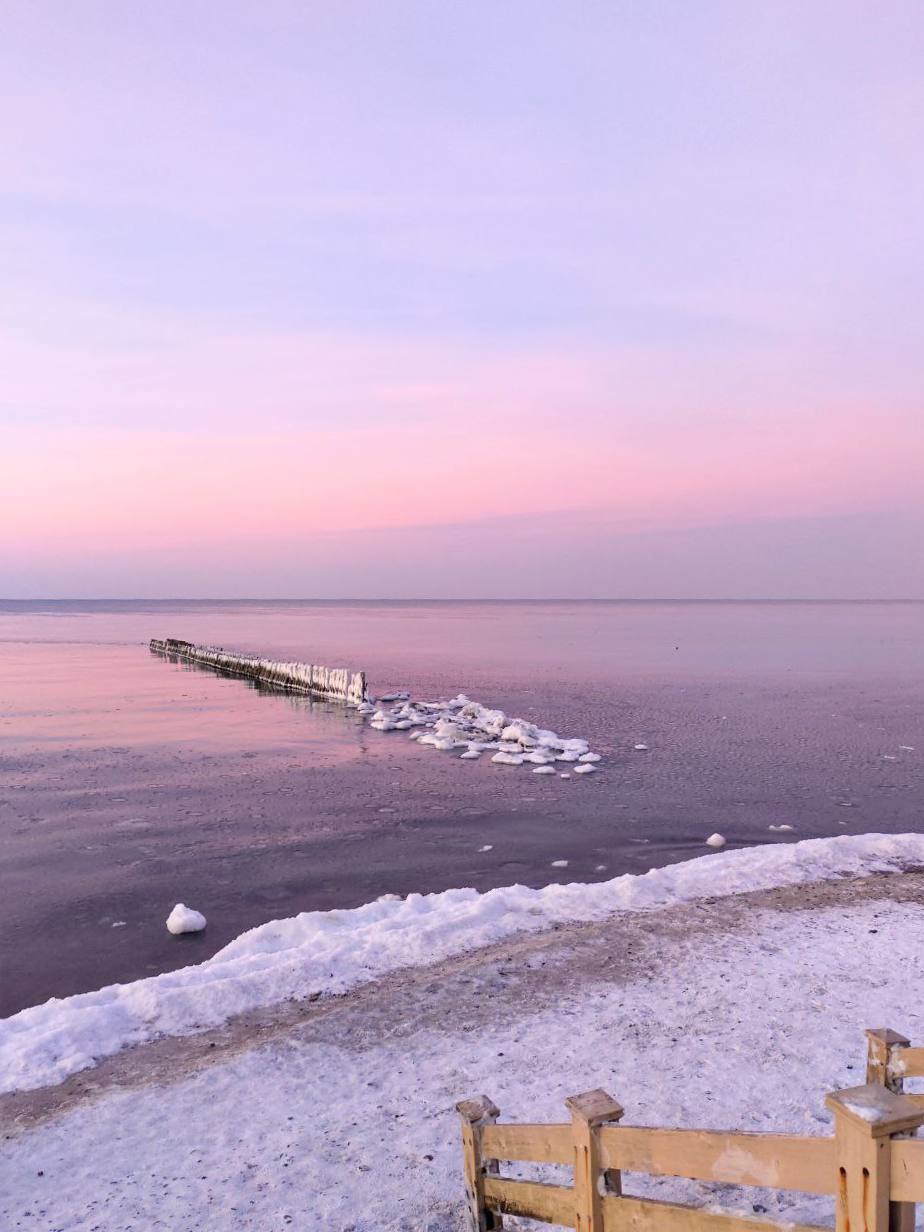 Даже в студёный январский день приятно прогуляться по пляжу Балтийского моря. На пути встречаются покрытые льдом камни и деревянные волнорезы, а закат окрашивает воду в нежно-персиковый оттенок.