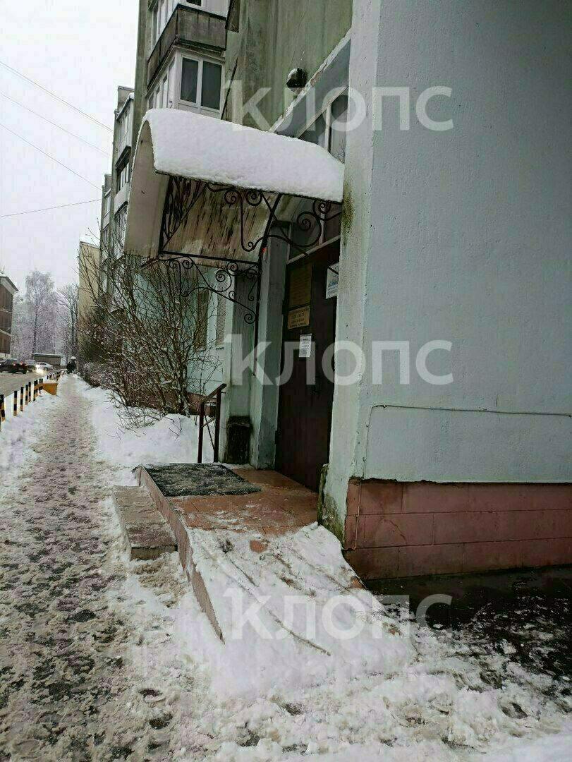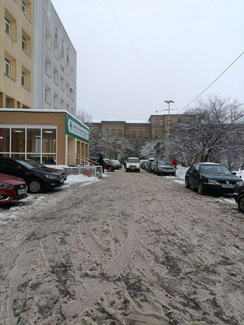 У здания всё в снегу, есть только несколько узких тропок, протоптанных пешеходами. Рядом — снежная каша и лёд. Часть тротуаров огорожена от сосулек и снега с крыш.