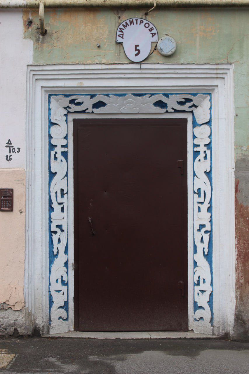 Здание со сложным адресом ул. Димитрова, 5-19, Брамса, 39 построено в период функционализма в 1929 году. За вдохновением архитекторы обращались, в том числе, к орнаментам Древнего Египта. Так в оформлении входных порталов и появились этнические узоры и каждый подъезд стал уникальным.