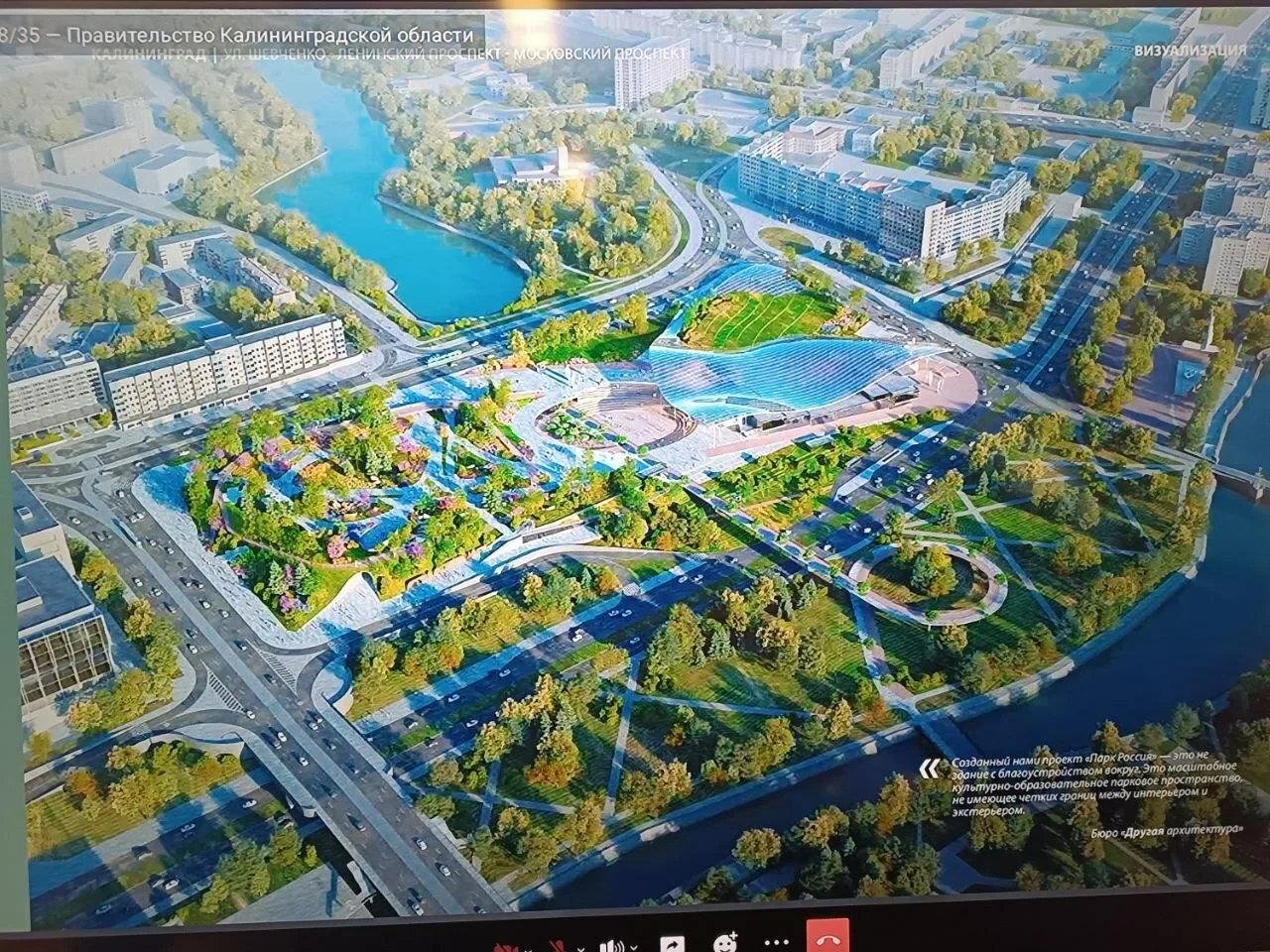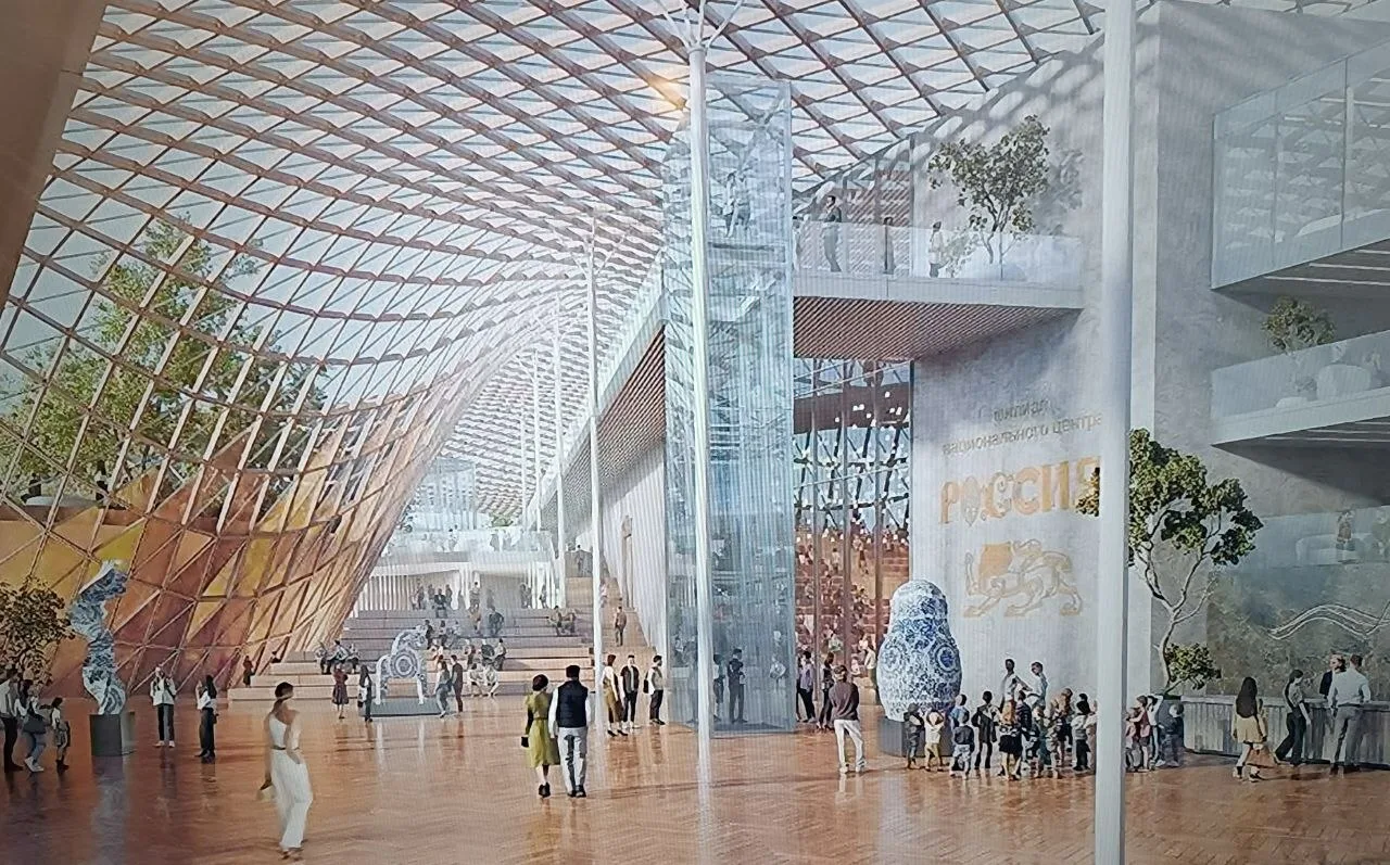 Объект внушительного размера хотят построить возле парка на месте Королевского замка. Новое пространство, включая зеленую зону и здание, займет всю площадь от Дворца бракосочетаний до Ленинского проспекта. Сам центр «Россия» предполагают построить в современном стиле. Вместо крыши – огромная стилизованная волна. Внутри – просторные залы и общественные пространства. Рядом появится открытый амфитеатр под навесом.