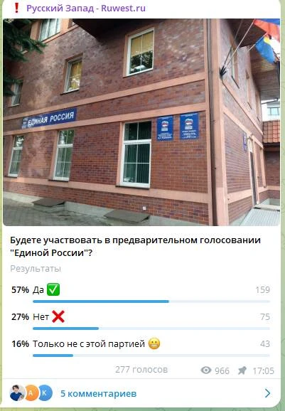 Но «Русский Запад» почистил ботоизъявление, и вот вам чистый результат : в предварительном голосовании единороссов хотят участвовать 12% опрошенных. Не будут участвовать 48%.