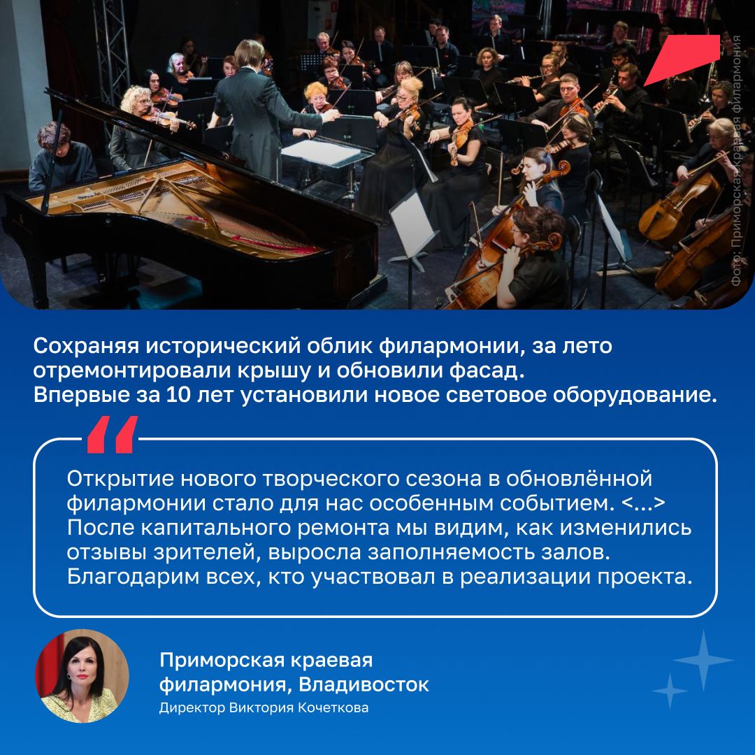 Чтобы музыка на концертах звучала ещё качественнее, по всей России обновляют филармонии: ремонтируют залы и устанавливают современное оборудование.