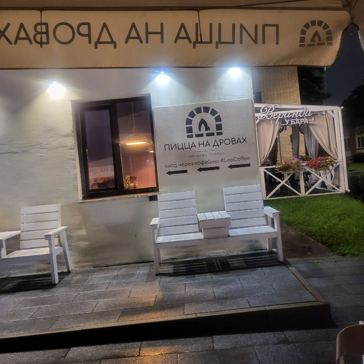 «Пицца на дровах» существует в симбиозе с кофейней #LeoCoffee, что создает оригинальную атмосферу. Один общий вход и веранда делают эти заведения взаимосвязанными. Интерьеры представлены несколькими небольшими залами, самым заметным из которых является тот, где расположена дровяная печь, где и готовят пиццу. Просторная веранда защищает от дождя благодаря надежным зонтикам.
