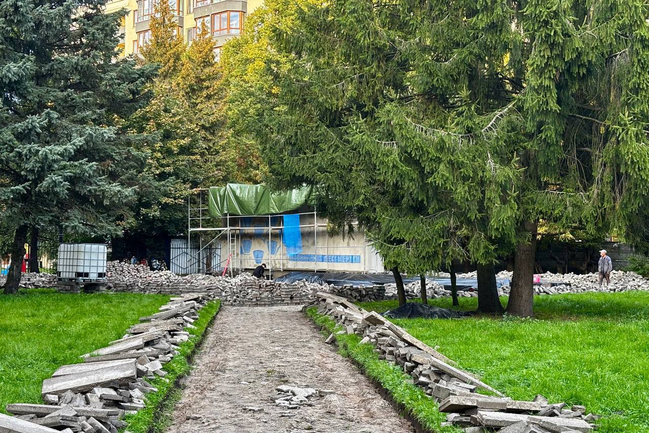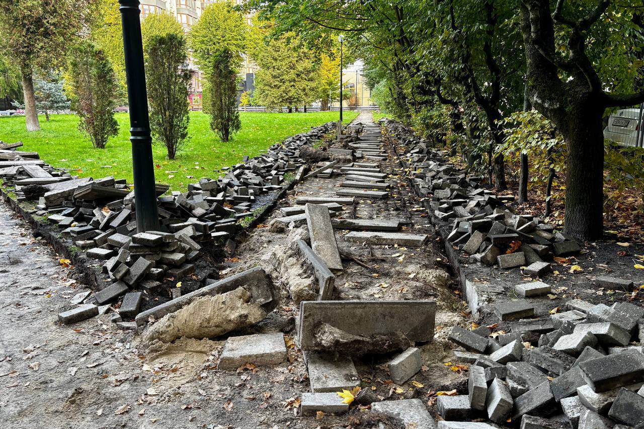 Подрядчик демонтировал старое покрытие пешеходных дорожек и убрал старые скамейки. Мастера также приводят в порядок мемориал.