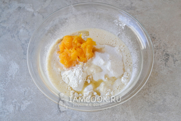 Если используется свежая тыква, нарезать ее кубиками, поместить в сотейник с малым количеством воды и томить на медленном огне до мягкости. Затем размять до состояния пюре при помощи вилки или блендера. Замороженную тыкву следует просто разморозить и размять.
