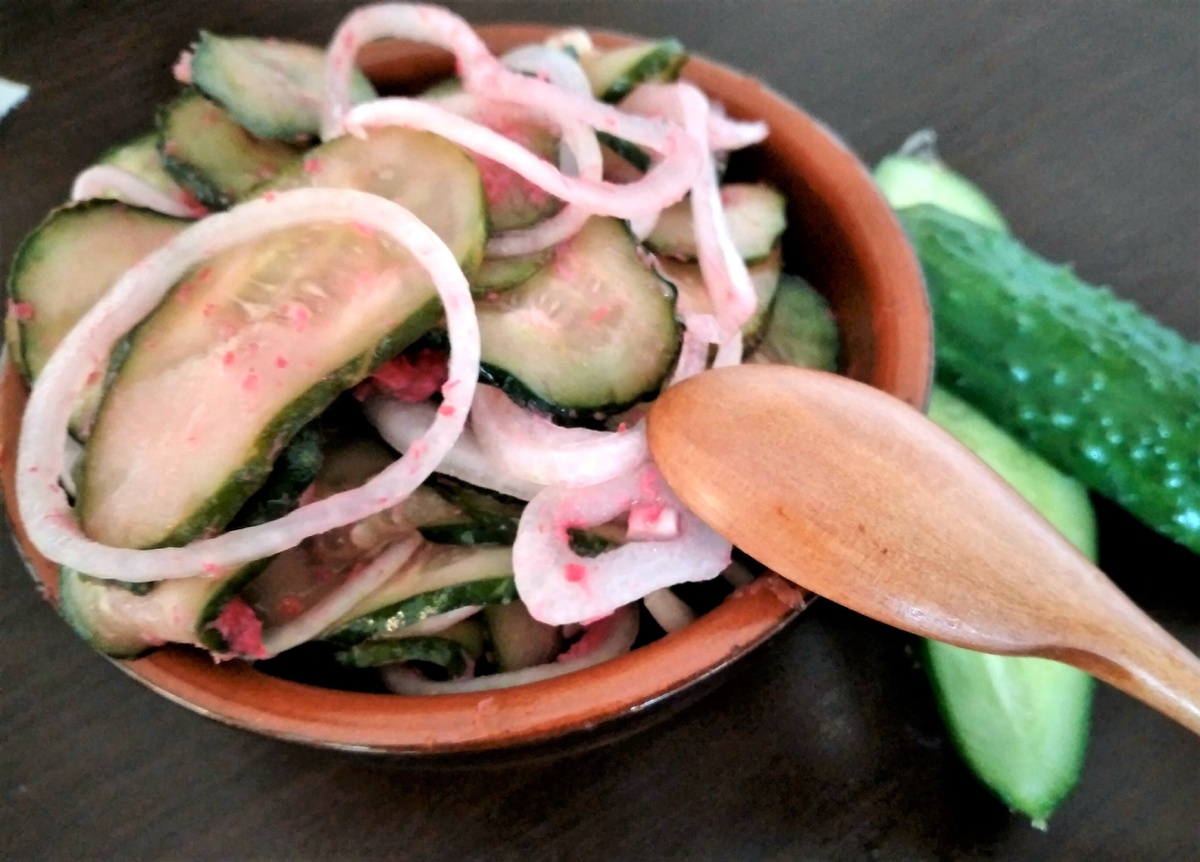 В глубокой миске смешиваются огурцы, лук и хрен, к ним добавляется уставленная вода, уксус, соль и сахар. Важно тщательно перемешать ингредиенты, чтобы соль и сахар растворились, а огурцы покрылись ароматным рассолом. Миска накрывается крышкой и остается в холодильнике на ночь для маринования.