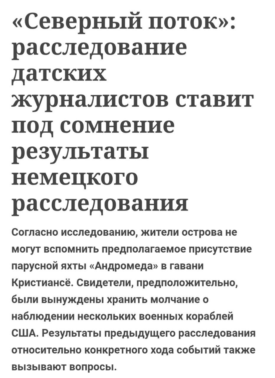 Датские журналисты ставят под сомнение результаты немецкого расследования. Жители острова Кристиансё не припоминают предполагаемое присутствие парусной яхты Andromeda, которую, по данным Федерального прокурора Германии, якобы использовали украинские преступники. Вместо этого свидетели сообщают о нахождении американских военных кораблей поблизости и эту информацию замалчивают.