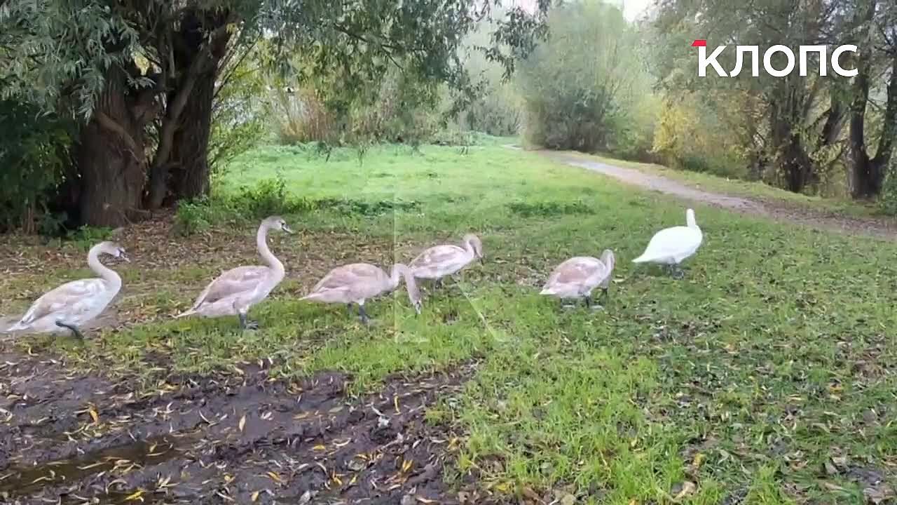 На кадрах видно, как стая птиц идёт по дорожке к пруду. Одна из них останавливается у припаркованной машины и начинает пощипывать боковое зеркало и кузов.