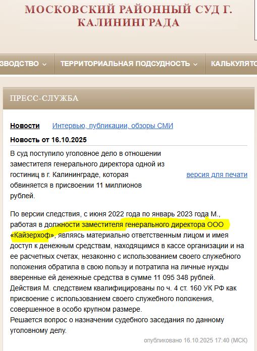 Как выяснил «Русский Запад» по открытым данным суда, 14 октября 2025 года в суд пришло уголовное дело на Юлию Талгатдиновну Мамедову. На сайте Национальной гостиничной премии она называется руководителем комплекса «Кайзерхоф» (4 звезды) в Калининграде. Отель расположен в «Рыбной деревне» у Юбилейного моста.