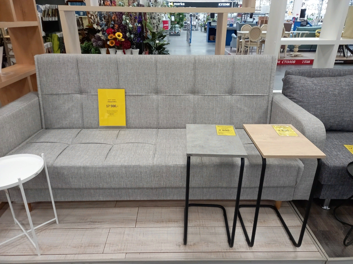 Обходя отделы, обнаруживаются журнальные столики за 20 тысяч и тумбы под телевизор, стоимость которых достигает 33 тысяч рублей. Здесь нельзя не вспомнить о довольно странном случае: недорогой стол за 8 тысяч оказывается самым прибыльным предложением, хотя его качество вызывает много вопросов — впечатление хлипкости не покидало.