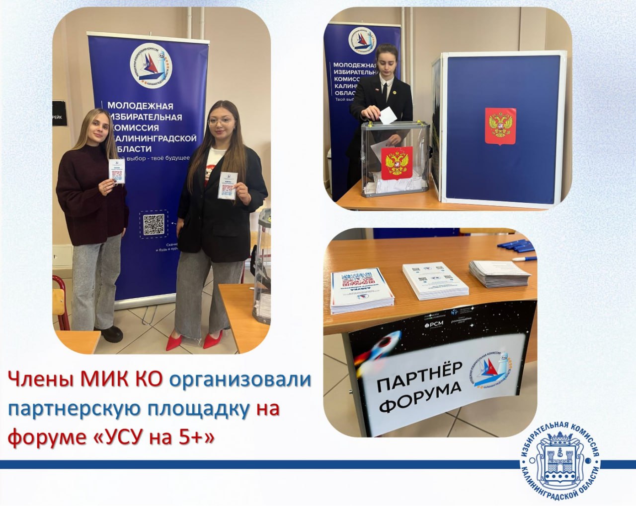 Молодежная избирательная комиссия Калининградской области приняла участие в восьмом региональном форуме ученического самоуправления «УСУ на 5+», реализуемом в рамках проекта Комплексная программа поддержки и развития ученического самоуправления «УСУ на 5+» при поддержке Росмолодёжь.Гранты. Форум проходил в стенах Западного филиала Президентской академии РАНХиГС.