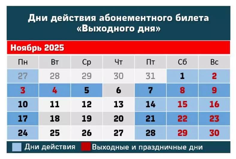 Билеты «Рабочего дня» будут действовать с 27 октября по 1 ноября, с 5 по 7 ноября и далее по расписанию. «Выходного дня» — 27 октября, 1—5 ноября, 7 — 10 ноября и далее по понедельникам, субботам и воскресеньям.
