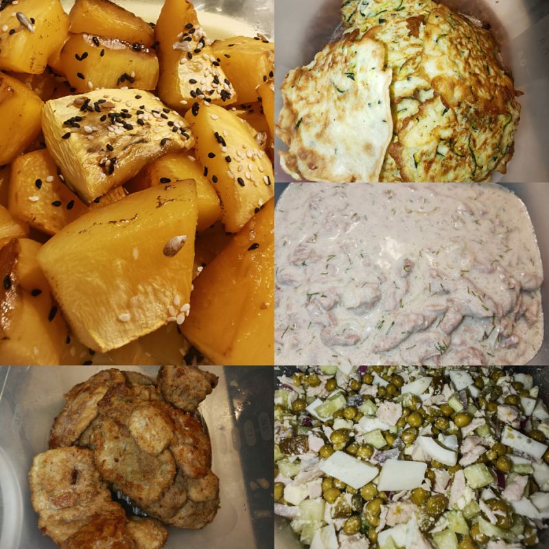 Параллельно с работой для клиентов, были приготовлены аналогичные блюда и для себя, включая вариант Оливье с индейкой и кабачковые оладьи. Это обеспечивало не только вкусное разнообразие, но и запасы на будущее.