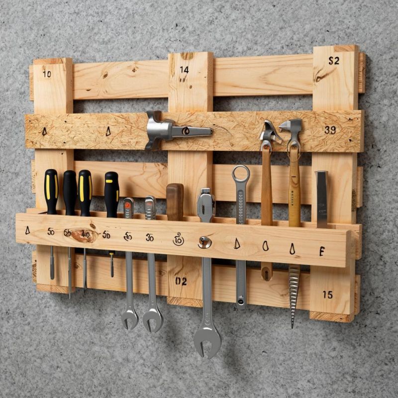 Идея использования поддонов вDIY-проектах уже давно не новинка, но именно для организации инструментов она открывает огромный потенциал. Обычный поддон, предназначенный для транспортировки грузов, оказывается настоящей находкой: он прочный, удобный и является отличным холстом для творчества. Вешалка, выполненная из поддона, не просто аккуратно хранит инструменты — она производит эффектный визуальный акцент на стене.