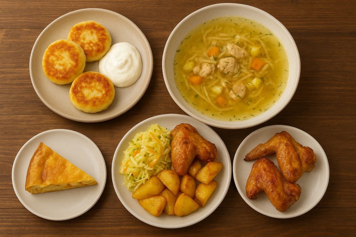 - Обед: куриный суп с лапшой — легкий и домашний.