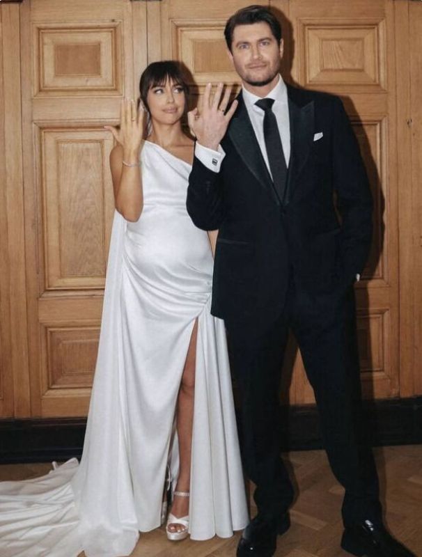 Звонкоголосая певица Мари Крамбрери и популярный блогер Дава стали супругами в феврале 2025 года. В тот же месяц они поделились радостной новостью о скором пополнении в семье. Невеста выбрала для своего особенного дня платье чистого белого цвета с эффектным разрезом и шлейфом. Несмотря на свое «интересное положение», Мари была неотразима в туфлях на каблуках, а округлившийся живот только добавил очарования ее образу.