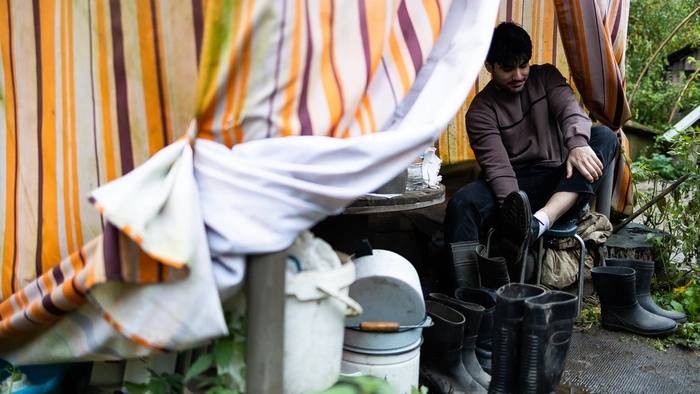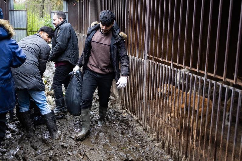 Волонтёрам досталась непростая работа — уборка территории между вольерами. Осенний дождь размыл грязь, ноги вязли в чавкающей жиже.