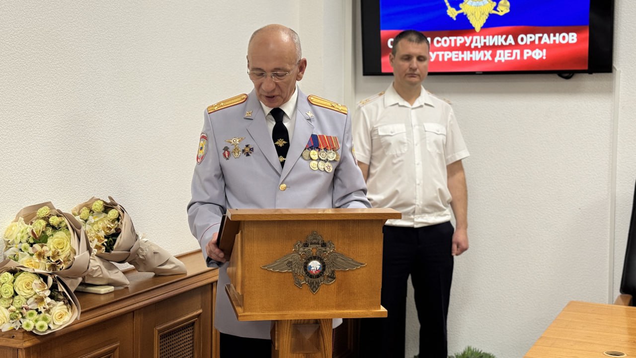 С поздравительной речью к собравшимся обратился начальник ведомства полковник полиции Сергей Титов.