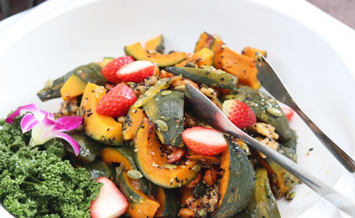 Этот тыквенный салат получится более вкусным, если добавить в него какие-нибудь обжаренные семечки или кедровые орешки.