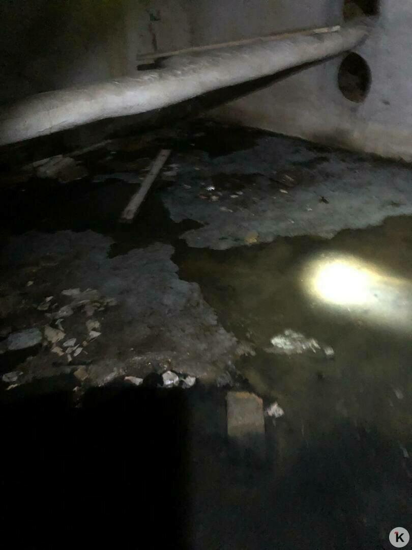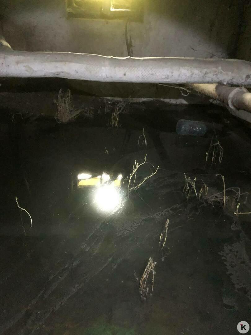 Без резиновой обуви в подвал не пройти: глубина где по щиколотку, а где и по середину голени. В некоторых местах вода относительно чистая, недавняя, в других — застоявшаяся, гнилая, с клочьями вонючей пены. На поверхности — радужные разводы. Толща кишит личинками насекомых.