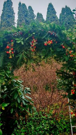 Арку и калитку декорировали ветками можжевельника, а чтобы оживить тёмно-зелёную гамму, добавили веток кизильника с алыми круглыми ягодками.