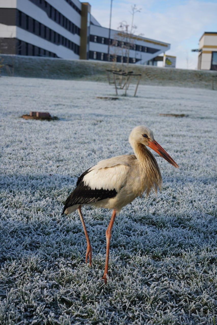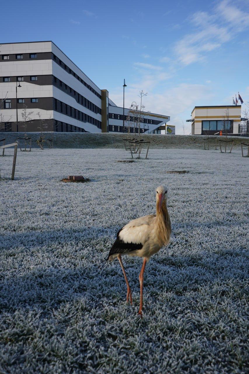 Гуляет около КПП: на территорию калининградского онкоцентра залетел аист