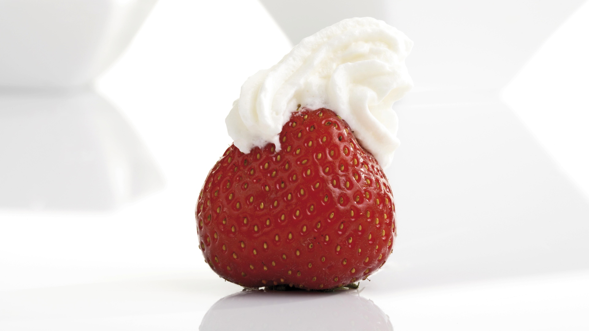 Пропорции сметаны и сливок для этого десерта примерно должны быть 1 к 1. Взбивать продукты нужно охлажденными и непременно холодным венчиком. В результате получается очень нежный крем, с которым можно подавать клубнику.